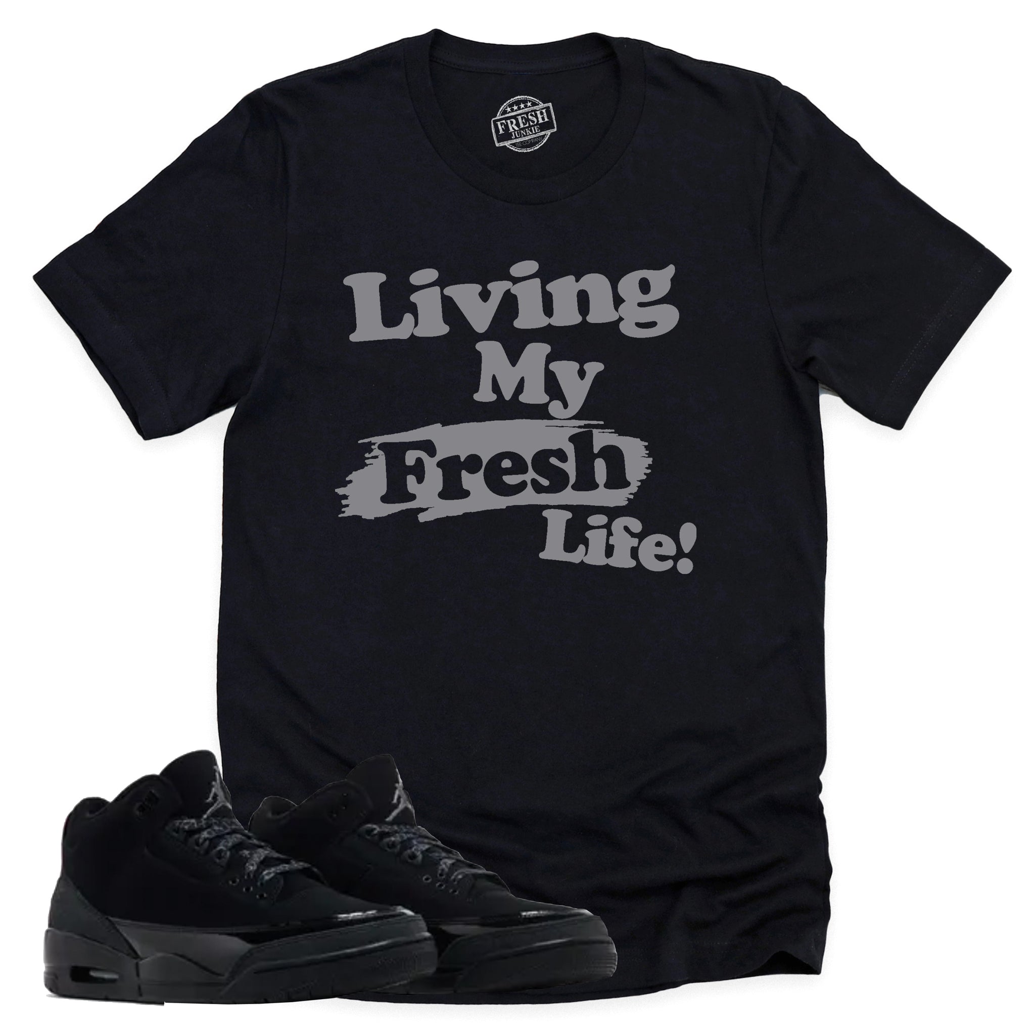 Living My Fresh Life Shirt | Air Jordan 3 Black Cat Inspired Tee is the perfect tee to match the Air Jordan 3 Black Cat Sneakers! This Fresh Junkie tee is perfect for any sneakerhead!